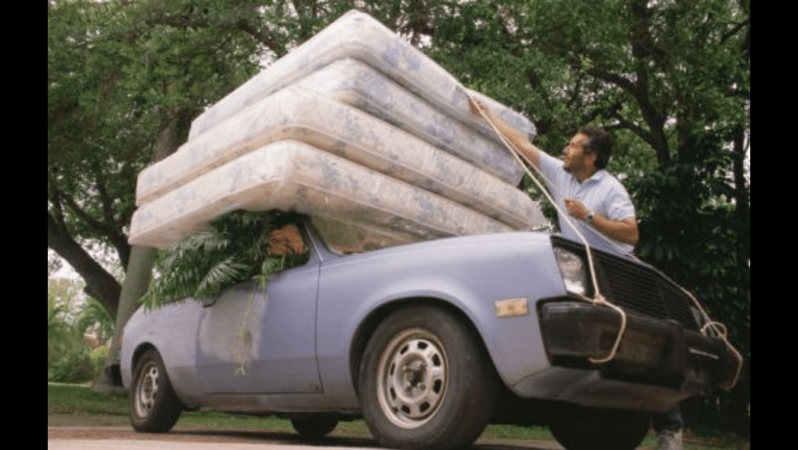 I couldn’t answer the question for the king-size mattress leapt out of the bed of the truck and sailed into the air…