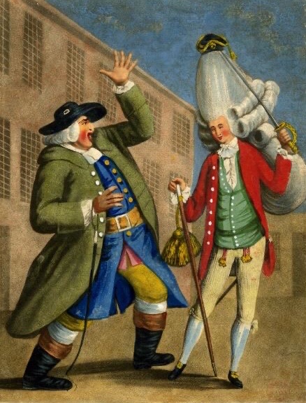 Now this is a full rebellion against formal attire: having a wig as tall as a bird condo. You can’t get any more extreme than a powder-white wig so vertical you need a cane to remove your tiny cap (chapeau bras).