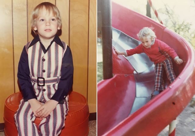 The picture of me on the left, sitting on a burnt-orange Naugahyde ottoman, has echoes of Macaroni with the giant belt buckle and buttons on the tight vest. Still, no lace or ruffles but plenty of colorful stripes that continue onto the next picture.
