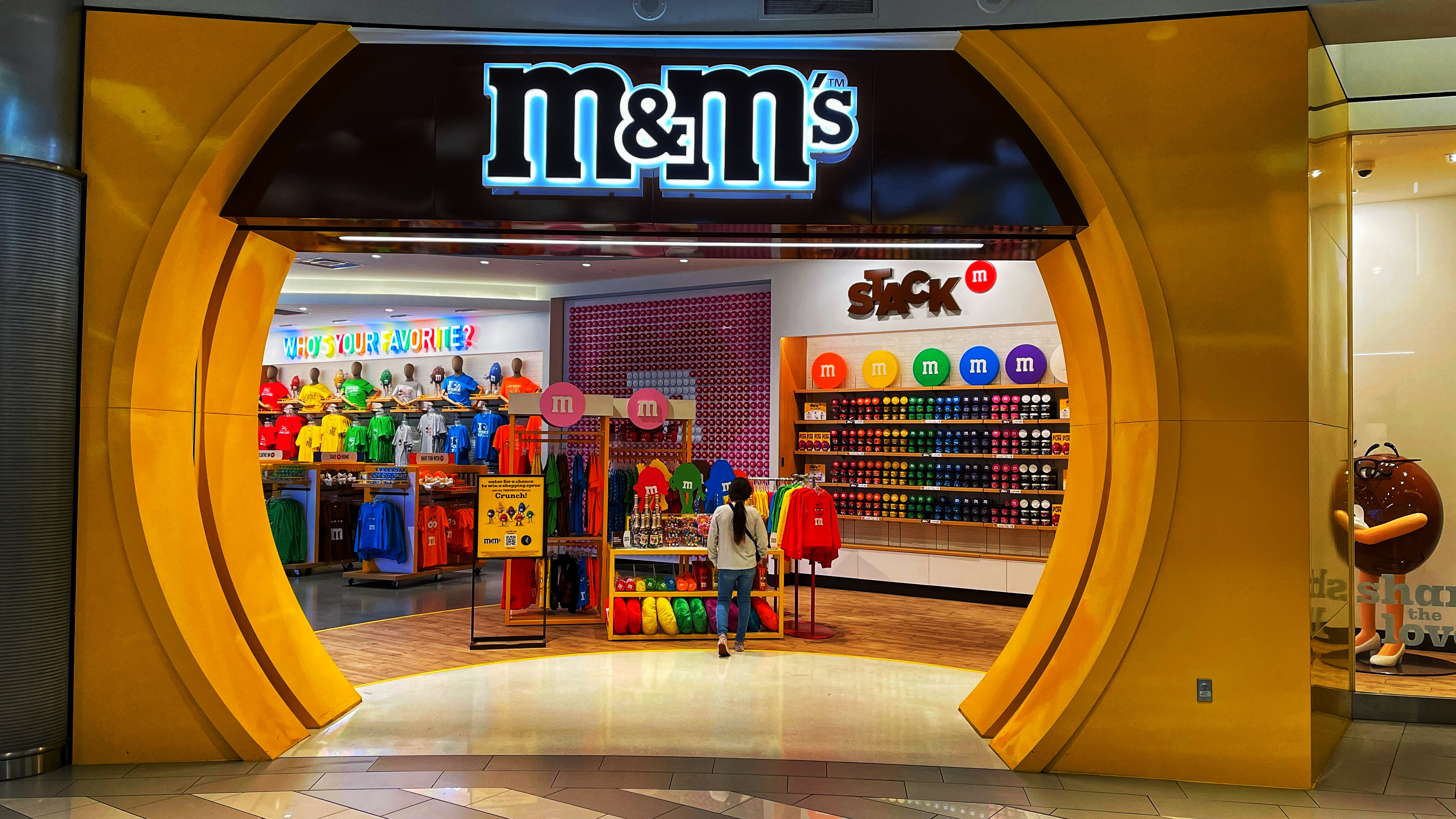 Wait in line to get my picture taken with the M&M Gang. They are a no show. Still buy a five pound bag.
