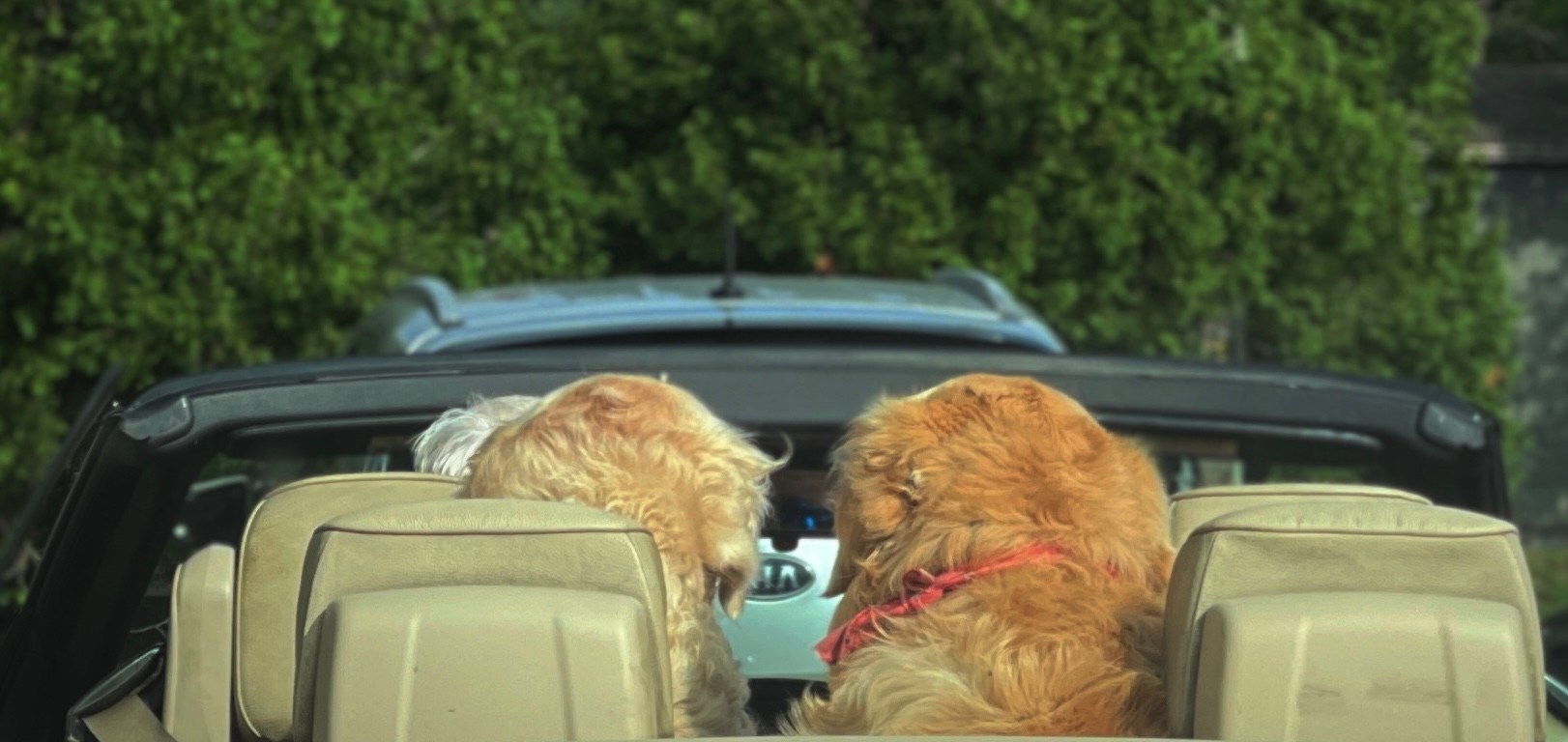Waiting my turn at a drive thru, I notice an elderly couple in the front seats of a convertible with two golden retrievers in the back.