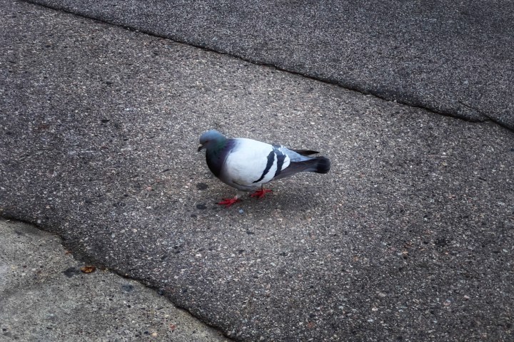 Walking through downtown, I’m about to cross an intersection except there are two pigeons in my way. One is muy gordo.